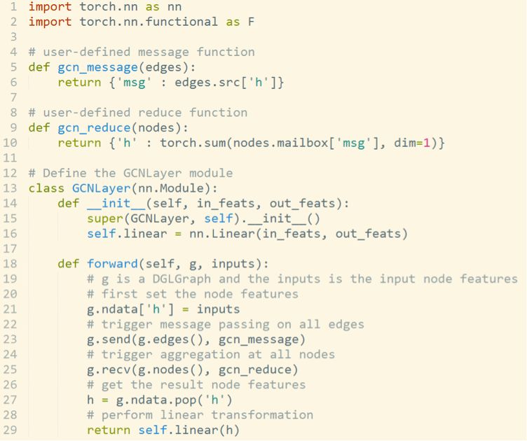 DGL 的编程模型正基于此。以下是图卷积网络在 DGL 中的实现(使用 Pytorch 后端):