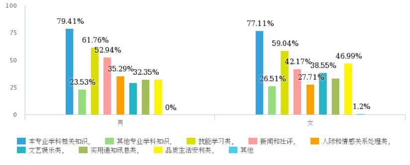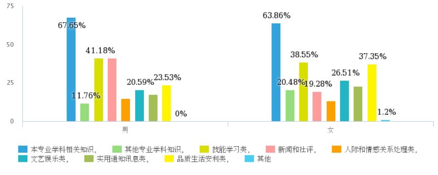 男女生收藏之后更愿意看的信息类型差异则较大,虽然大家都最愿意看本专业学科知识,但愿意看新闻社评信息的男生比例远高于女生,愿看品质生活安利类信息的女生比例也远高于男生。(图4、5)