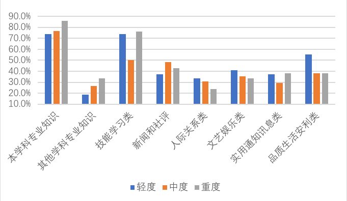 从图6中可以看出,心理压力大的学生,特别是重度心理压力的人,倾向于收藏本学科和其他学科专业知识、技能学习、新闻社评等严肃信息的比例高于心理压力程度轻的人。而心理压力程度轻的同学,收藏文艺娱乐类、品质生活安利类等信息的比例要更高。