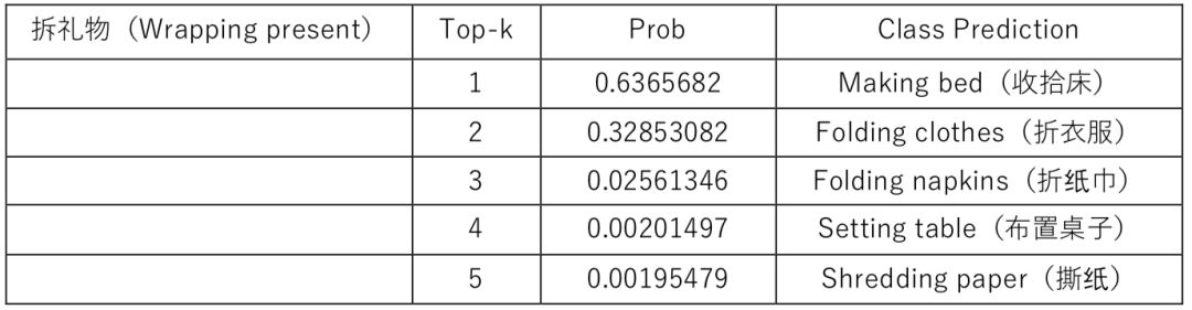 如表 1 和表 2 所示,第一列是官方视频分类标签,后三列显示了机器预测结果的前五个分类结果,按照置信概率将五个预测结果进行降序展示。显而易见的是第一个视频中的鼓掌动作行为还是被机器很好的预测了出来。至于第二个拆礼物行为,确实没有一个正确的预测结果,机器还比较充分的相信这是一个收拾床的行为,在这一点上,人类的识别准确率还是远高于机器识别的准确率。