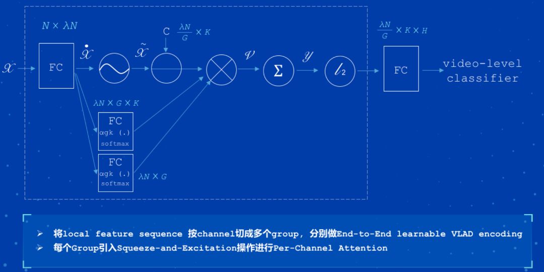 NeXtVLAD 是 2nd-Youtube-8M 比赛中最佳单模型,该模型弱化了时序关系,适合建模短视频。图 4 为 NeXtVLAD 模型的框架结构。