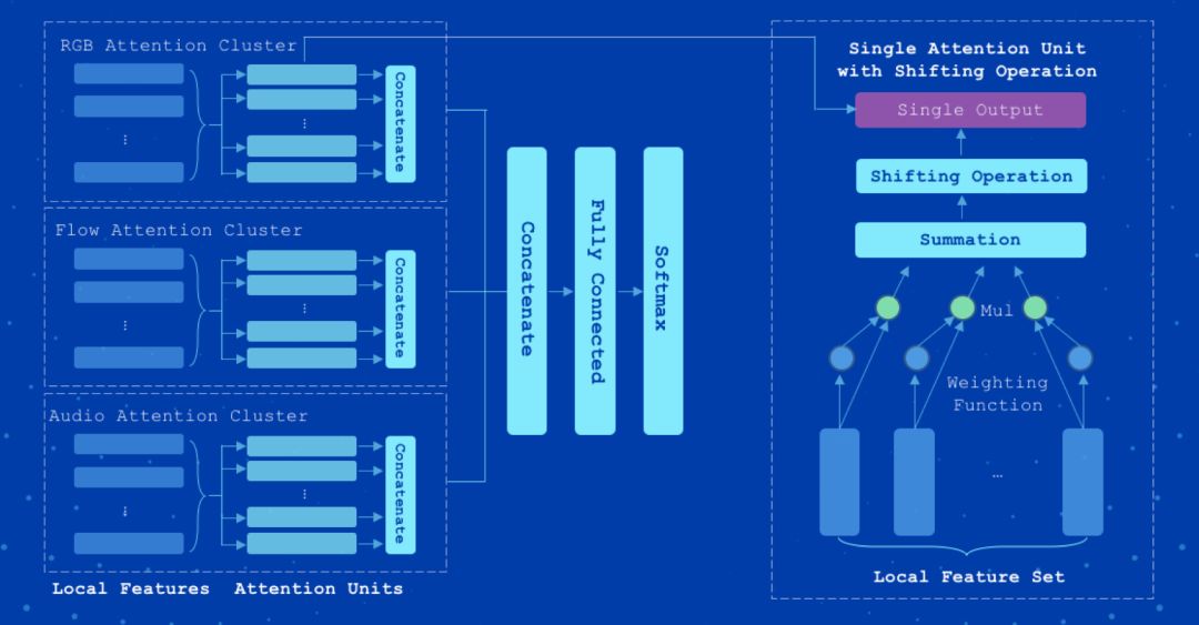 Attention Cluster 采用了视频多模态特征注意力聚簇融合方法,曾助力百度计算机视觉团队夺得 2017 年的 Kinetics600 大赛冠军。该模型通过带 Shifting operation 的 Attention clusters,处理经过 CNN 模型抽取特征的视频的 RGB、光流、音频等数据,实现视频分类。图 2 为 Attention Cluster 模型的框架结构。