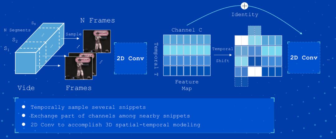TSM 在 TSN 基础上进行了改进,应用基于时序移位的简单高效视频时空建模方法。该模型简单高效,计算简单。图 7 为 TSM 模型的框架结构。