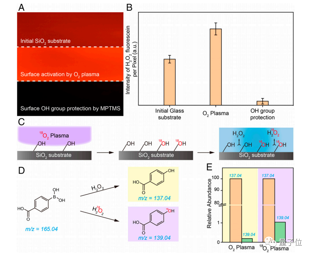 具体的过程则是通过质谱法,检测4-羧基苯基硼酸与表面18O2等离子体处理产生的18O标记的H2O2反应产物中的18O,证实了羟基参与H2O2的生成。