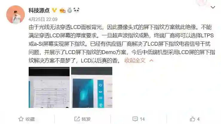 不过随着供应链的不断突破,AMOLED 屏幕垄断屏幕指纹的局面有望被打破。根据网络消息,供应链厂商阜时科技宣布成功开发基于LCD 面板的屏幕指纹方案,而且利用神经网络深度学习方案,识别速度和准确率已经和电容式指纹识别差不多。
