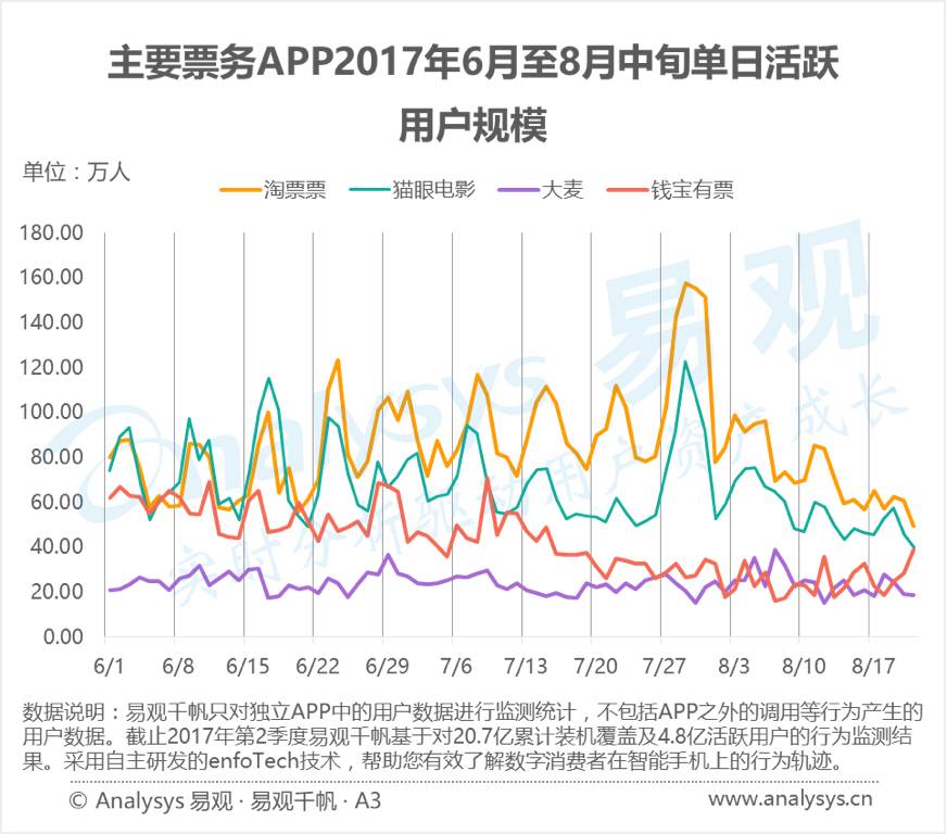 表现在票务APP方面,与6月相比,以淘票票、猫眼电影为代表的电影票APP均在7月实现较为明显的增长。虽然,在电影票购买渠道不断丰富的市场环境中,独立电影票APP不能完整表现市场规模,但其增长趋势足以体现今年暑期档的强势。但后续的接档《战狼2》影片恐难以维系票房热度。体现在APP数据方面,可以看到,随着《战狼2》放映期临近结束,电影票务APP活跃用户规模曲线开始下滑。