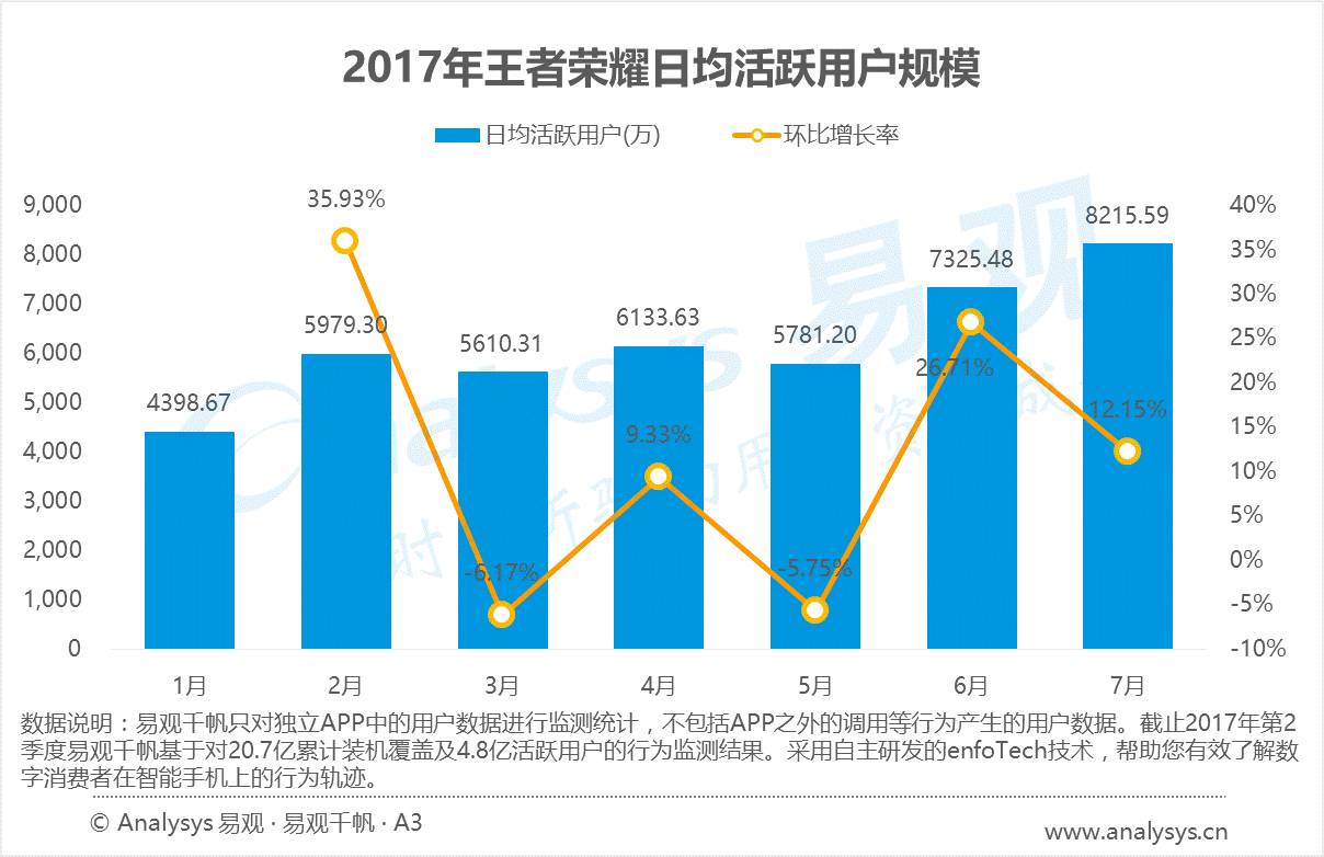 在规模上,王者荣耀目前仍处于上升通道。2017年7月,王者荣耀的日均活跃用户规模为8215.59万人,环比增长率为12.15%。而进入暑期档的特征显著就是,学生仍是主要用户群之一。但用户占比上,中小学生占比持续降低,防沉迷系统效果显著。