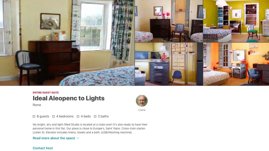 假房生成网站 thisairbnbdoesnotexist.com,每次刷新都会出现一个虚假的房源,网页上的照片、文字描述、发布人头像均由计算机自动生成。由于使用的模型非常简单,文字描述多有不合逻辑之处,但乍看上去还是能以假乱真。来源:假房生成网站 thisairbnbdoesnotexist.com