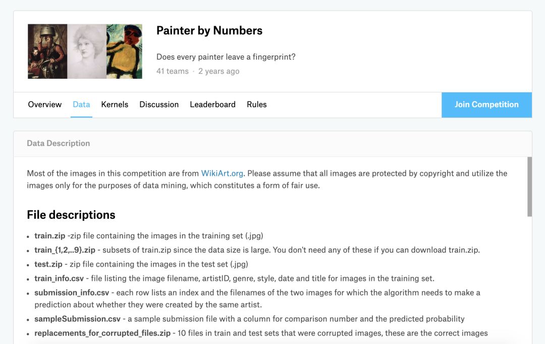 在数据方面,采用的是Kaggle上名为”Painter by Numbers“项目中的数据集,其中大部分的图像数据来源于WikiArt.org网站。