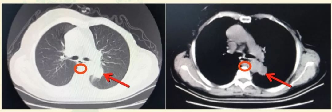2018年12月起,患者进食梗咽感并进行性加重至无法进食。CT检查发现纵隔淋巴结转移、肺转移、左肾上腺转移。请消化内科会诊,认为无法进食系纵隔淋巴结转移压迫食管所致,遂行食管扩张术,鼻饲管全流质饮食。超声检查示左侧锁骨上窝低回声结节3.18×2.54cm,考虑淋巴结转移。CA15-3为80.7U/mL。左侧锁骨上淋巴结穿刺活检,病理示:小灶转移性腺癌,符合转移性乳腺癌,免疫组化:ER(-)PR(-)HER2(3+)。患者拒绝肺穿刺病理学检查。