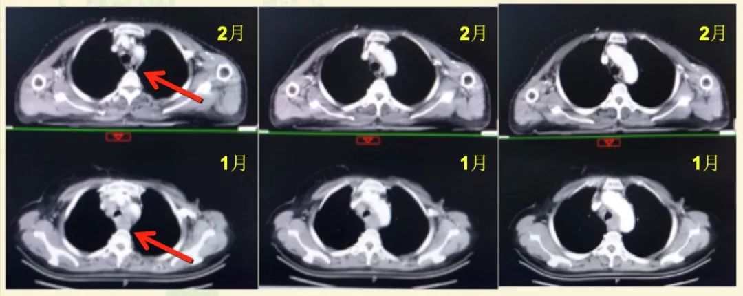 于2019年2月1日起行“曲妥珠单抗+紫杉醇(qw*3)方案治疗两周期,2019年3月14日复查,超声示左锁骨上窝结节1.73×1.70cm,较前缩小。胸部CT示左纵隔淋巴结及左肺下叶背段转移瘤与前片比较明显缩小。CA15-3降至52.18U/ml。