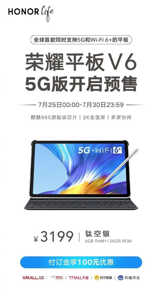 荣耀平板 V6 钛空银 5G 版本今天正式开启预售,6GB + 128GB 售价 3199 元。