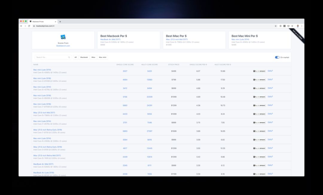 虽然有 数据 显示近期 Mac 的销量有所下滑,但其市场占有率却仍在提升。越来越多的开发者、设计师,以及文字工作者都偏向于选择 Mac 作为其主力生产工具。选择一款适合自己的 Mac 很关键,Macbook Prices by Performance 细心的整理了目前在售的 Mac 数据,包括 MacBook,Mac mini,以及 iMac 产品线。特别地,其提供了每一款 Mac 的性能跑分结果,我相信你可以参考选择一款兼顾性能和价格的 Mac。
