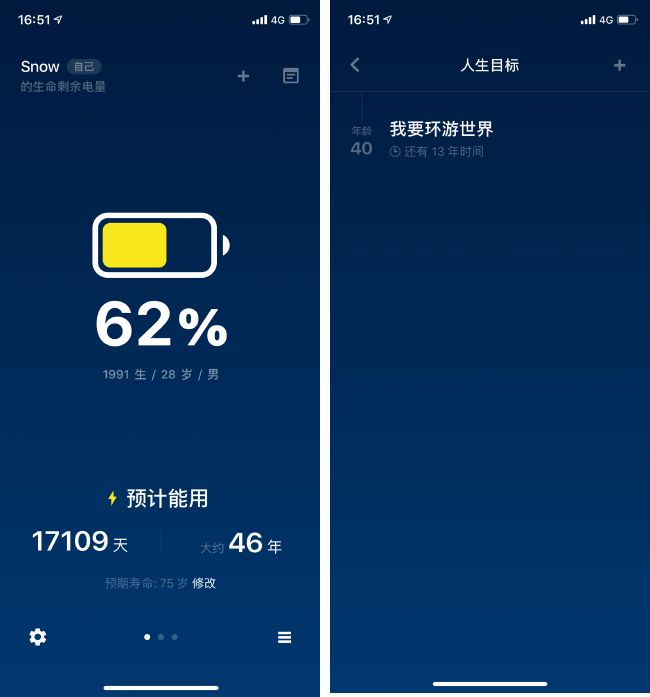 此外,在有限的时间里,你或许有许多目标需要完成,点击右上角的按钮,你可以添加人生目标和 deadline,我希望自己在 40 岁之前,能进行一次环球之旅,不知是否可以实现呢。