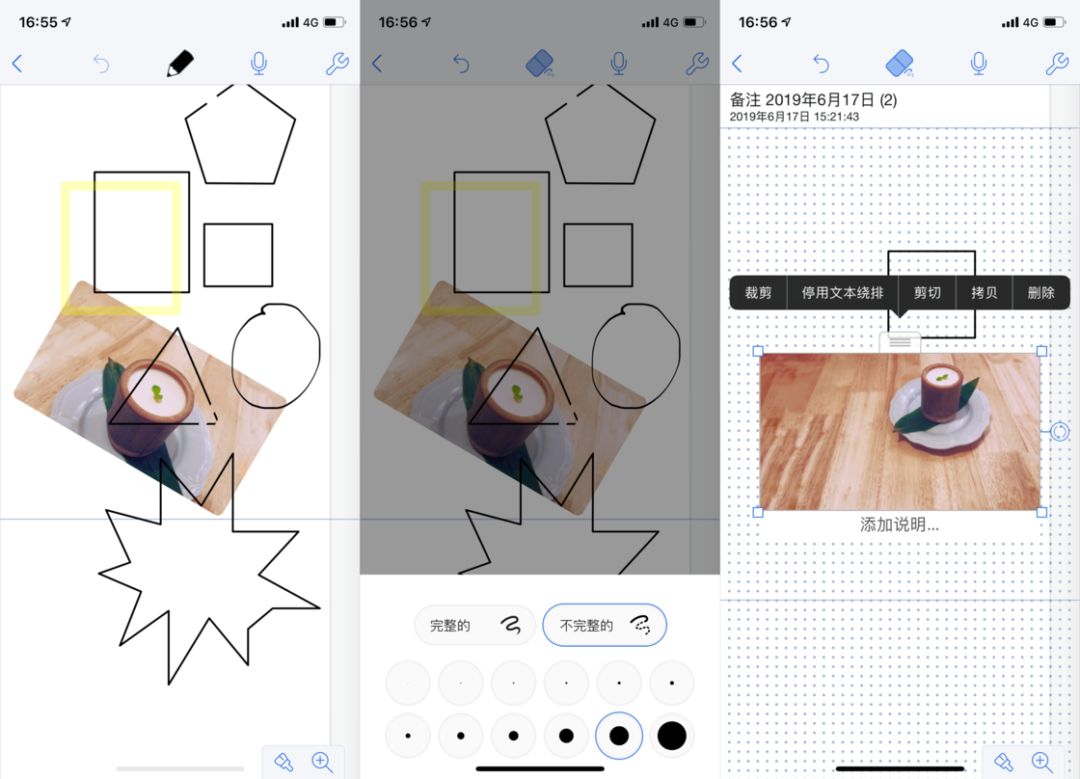 除了绘制图形外,新版的橡皮擦终于支持局部擦除,不小心划过头的标记,终于不用再整条删除。不过橡皮擦依旧仅支持擦除墨迹和形状,导入的图片还是擦不得的。说到图片,此次更新对导入图片的裁剪和旋转操作也进行了优化,使用起来稍稍便捷一些。