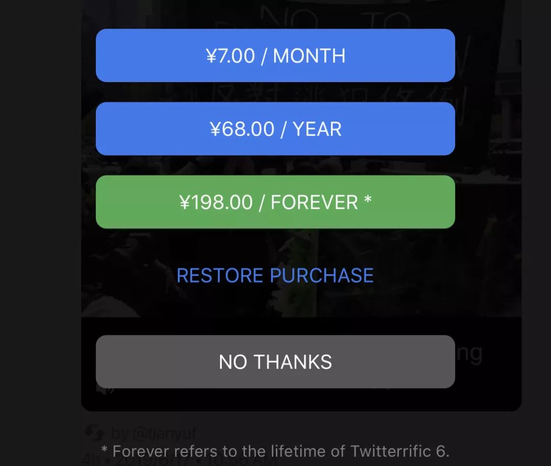 Twitterrific 这次大版本升级最大的改变还是调整了自己的付费模式:全部功能免费对所有用户开放,提供了 ¥68 / 年或 ¥198 一次性买断的选项让你可以去除应用顶部的广告,其中买断制选项可以享受当前第六代大版本内的所有更新,之后的大版本更新可能需要重新付费。