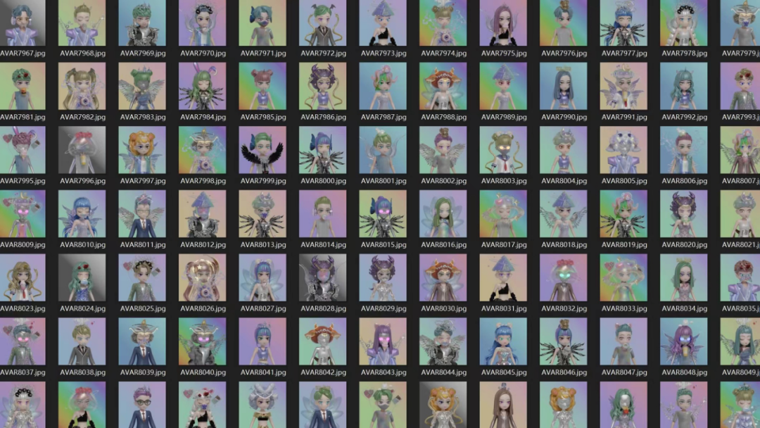 稳定的规模化生产是如何做到的?AVAR技术部介绍说,首先,自研的“人物融合”算法支持直接提取IP的关键信息,应用到三维框架中自动建立虚拟形象,一周内可以交付;其次,在三维编程的框架下,每个3D建模的指令都可以写成一行代码,然后进行批量生产。“我们将每个潮玩拆分成很多零件,头饰、面饰、服装、装置等零件经过参数化建模,都可以套用、再组合,然后程序化生成新的作品。”