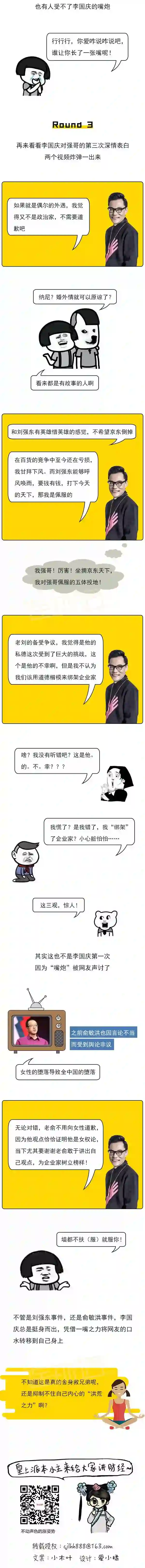 已广为人知的是,2018年12月~2019年2月,李国庆先后就俞敏洪“女性堕落导致国家堕落”演讲、刘强东美国明州涉嫌性侵女大学生案件、吴秀波出轨“小三”事件等舆论热点发言,一时如火上浇油,被网友讥为“插兄弟两刀”的“猪队友”。