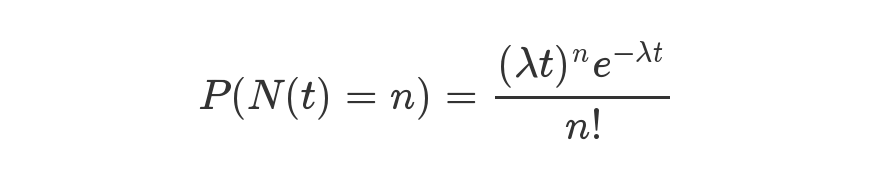 上面就是泊松分布的公式。等号的左边,P 表示概率,N表示某种函数关系,t 表示时间,n 表示数量,1小时内出生3个婴儿的概率,就表示为 P(N(1) = 3) 。等号的右边,λ 表示事件的频率。