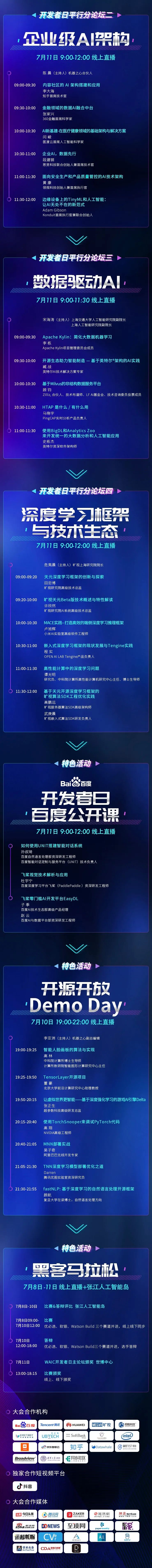 大环节,包括1场主论坛、4场分论坛、1场高峰对话、1堂百度公开课、1场开源项目Demo Day,1场黑客马拉松,这是一次丰富多元的学习之旅。