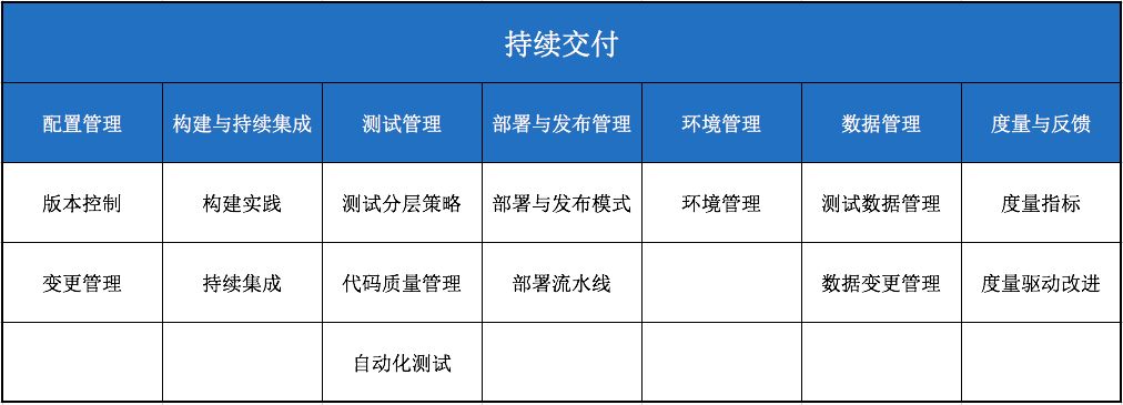 持续交付是指持续的将各类变更(包括新功能、缺陷修复、配置变化、实验等)安全、快速、高质量地落实到生产环境或用户手中的能力。在 DevOps 标准中持续交付的分级技术要求包括:配置管理、构建与持续集成、测试管理、部署与发布管理、环境管理、数据管理、度量与反馈等,如下图所示。