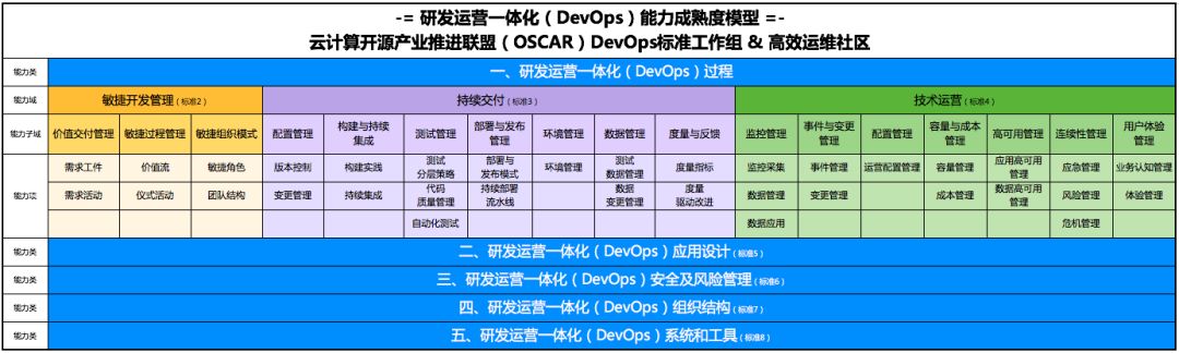 DevOps 标准评估体系主要包括敏捷开发管理、持续交付、技术运营、应用架构、安全及风险管理、系统和工具等部分的评估,目前可评估的部分主要是研发运营一体化(DevOps)过程中的持续交付部分。