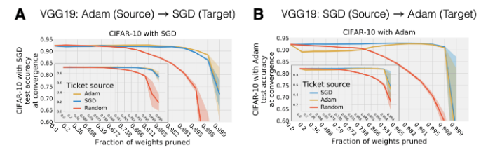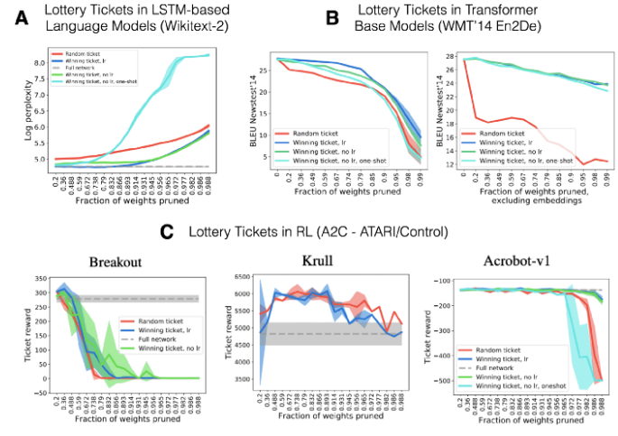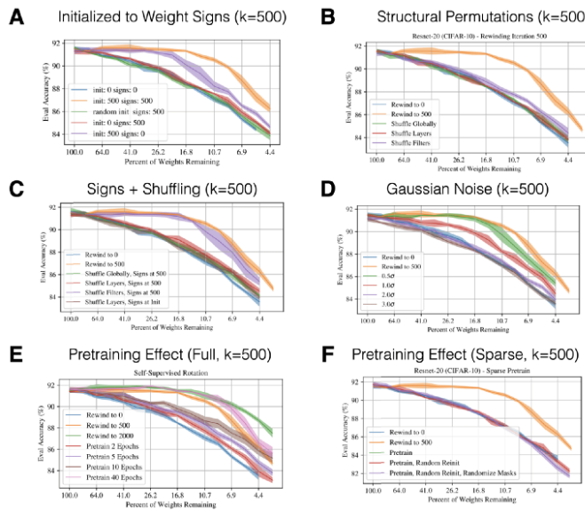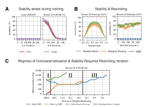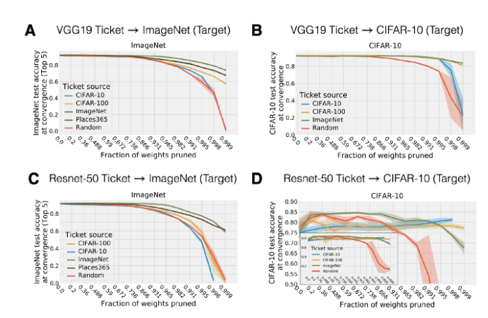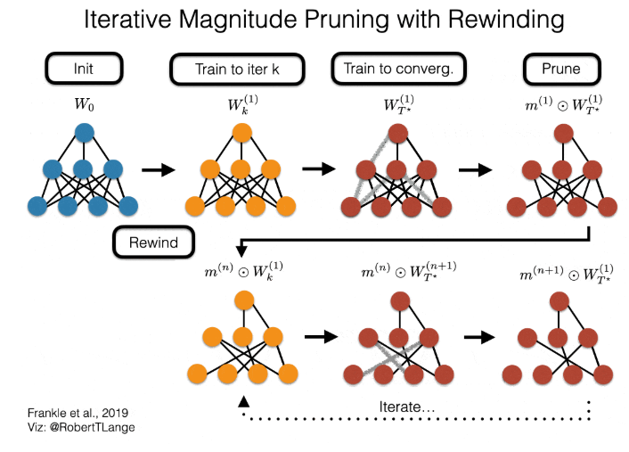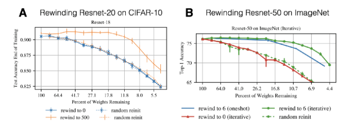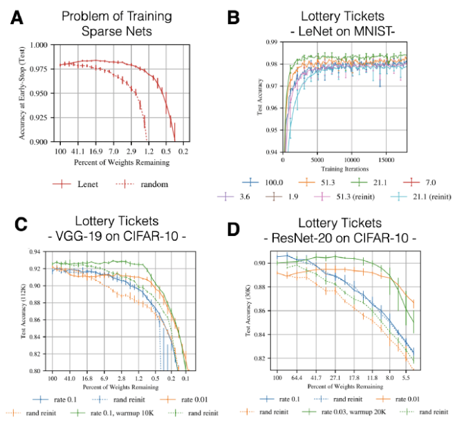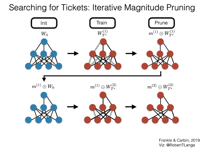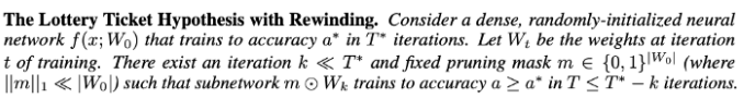 彩票假设:任何随机初始化的稠密的前馈网络都包含具有如下性质的子网络——在独立进行训练时,初始化后的子网络在至多经过与原始网络相同的迭代次数后,能够达到跟原始网络相近的测试准确率。