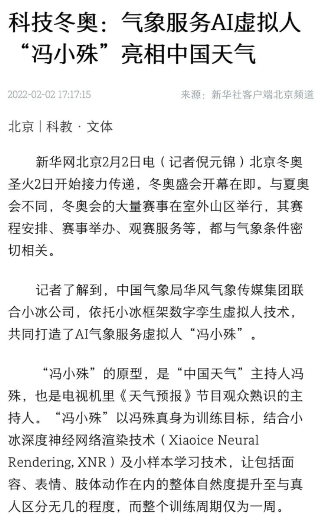 「冯小殊」的原型,是「中国天气」主持人冯殊,也是电视机里《天气预报》节目观众熟识的主持人。「冯小殊」的加入,也为这场「科技冬奥」贡献了一份来自AI的力量。