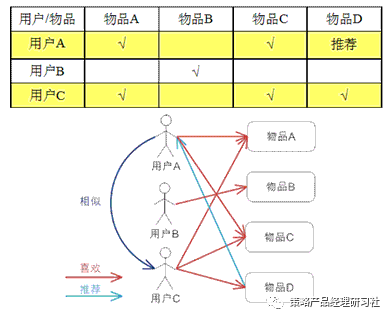 (下图就是一个例子,对于用户 A,根据用户的历史偏好,这里只计算得到一个邻居 - 用户 C,然后将用户 C 喜欢的物品 D 推荐给用户 A。)