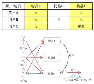 (举个例子,如图 3 ,对于物品 A,根据所有用户的历史偏好,喜欢物品 A 的用户都喜欢物品 C,得出物品 A 和物品 C 比较相似,而用户 C 喜欢物品 A,那么可以推断出用户 C 可能也喜欢物品 C。)