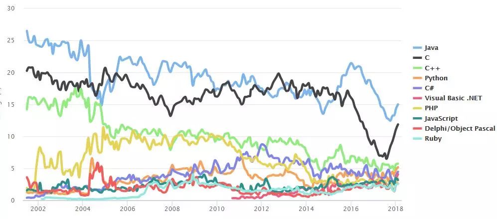 Top 10 编程语言 TIOBE 指数走势(2002-2018)