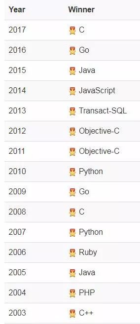 “年度编程语言”获奖名单如下图所示,该奖项授予一年中评分最高的编程语言: