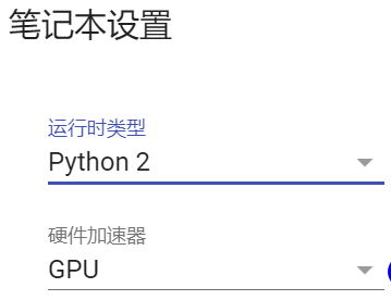 这个 Colab 的环境配置如下,打开「修改」-「笔记本设置」就可以看到。该 Colab 在 Python 2 环境和 GPU 上运行,这个不用修改,也不能修改,会报错。