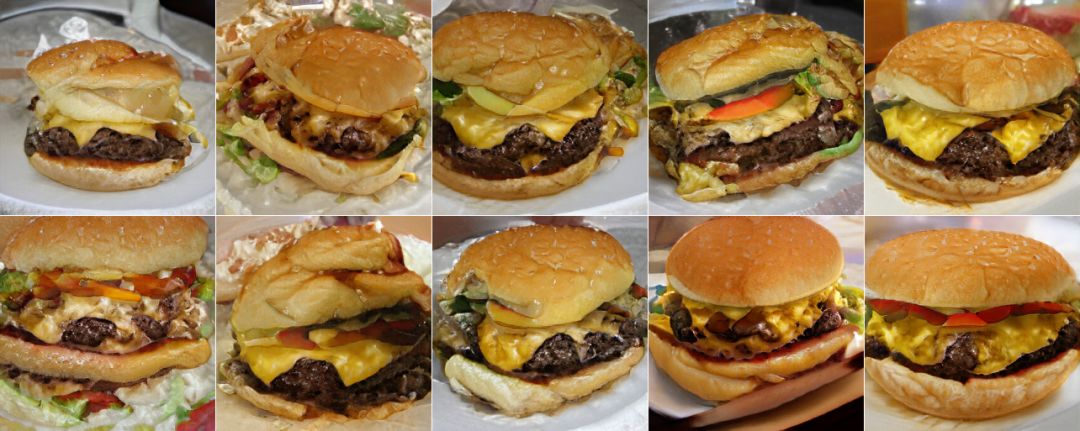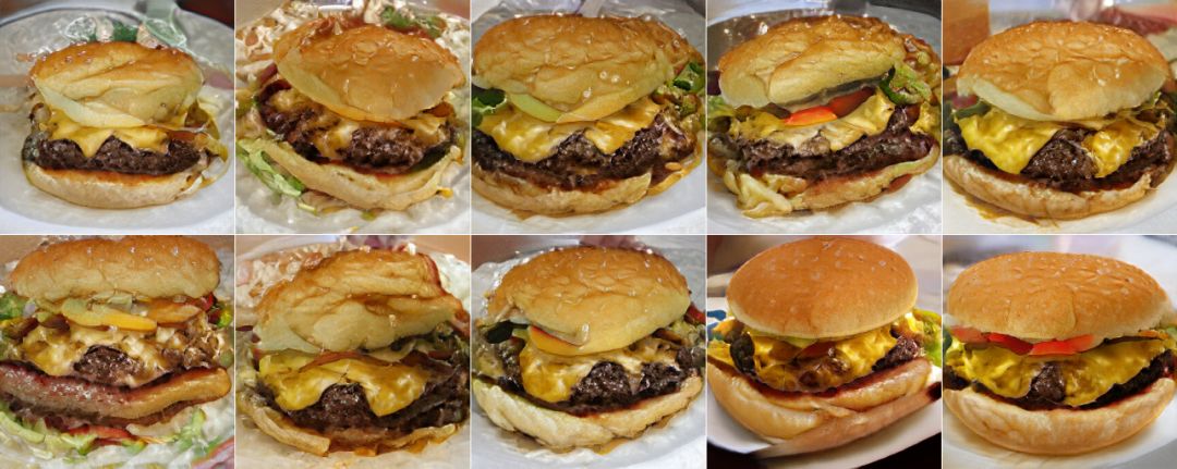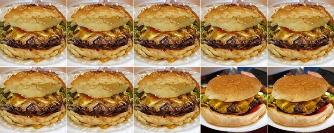 如上图所示,很容易看出,生成样本数量(10)和类别(芝士汉堡)就是字面的意思,那么截断值、噪声种子分别有什么作用呢?仅用一张图看不出来,我们修改一下参数看看区别就行了。