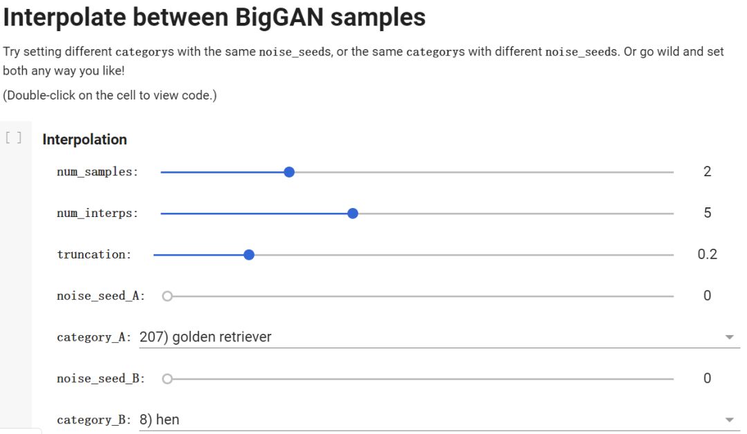 刚打开 Colab 时,我们可以看到代码总体上分成四大块,分别是 BigGAN Demo、Setup、Explore BigGAN samples of a particular category、Interpolate between BigGAN samples。前面两块给出了大致的使用说明,以及具体实现(从 TF Hub 加载预训练模型、定义函数、创建会话和初始化变量等),之后两块才是重点,提供了特定类别的图像样本生成,以及指定两个类别的图像插值两个任务演示。只需要点击几个按钮,我们就能轻松启动运行和修改参数,完全不需要修改代码。