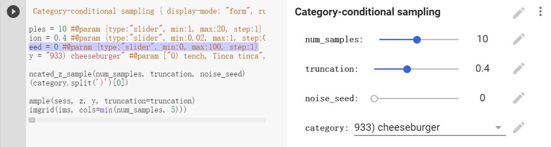 最后是类别参数的控制,该 Colab 中提供了 1000 个类别选项,可玩性很足,但要找到自己想要的类别实在有点困难。可以这样操作,双击这个单元格,代码会显示在左侧,右侧会出现铅笔图标,点击该图标后就能查看完整列表,在这个列表下用 Ctrl+F 搜索类别的编号,再返回修改,这样就简单多了。