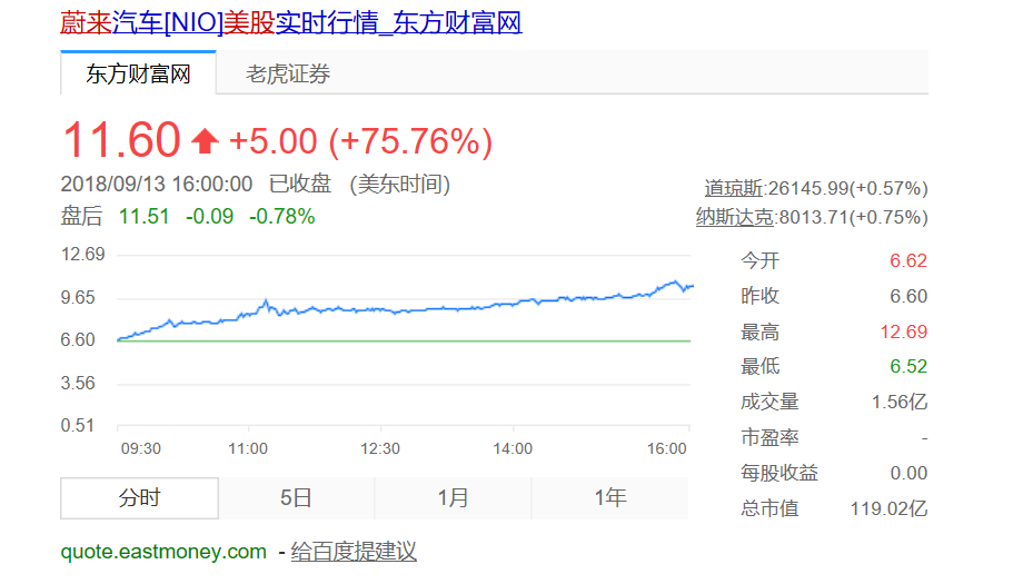 @东方财富网【中概股疯涨!蔚来汽车涨超46% 拼多多三天累计涨40%】9月14日消息,蔚来汽车上市第二日,盘中异动大涨一度超45%,刷新盘中高位至9.77美元, 随后有所回落。截至收盘,较前一日上涨达75.76%,股价来到创高位的11.60美元,总市值为119.02亿美元。