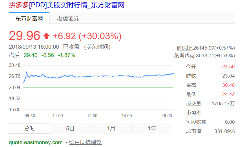 拼多多收盘大涨30.03%,股价上涨至29.96美元,为上市以来新高。拼多多已经连续五个交易日上涨,近三天累计涨幅一度超40%,总市值331.89亿美元。