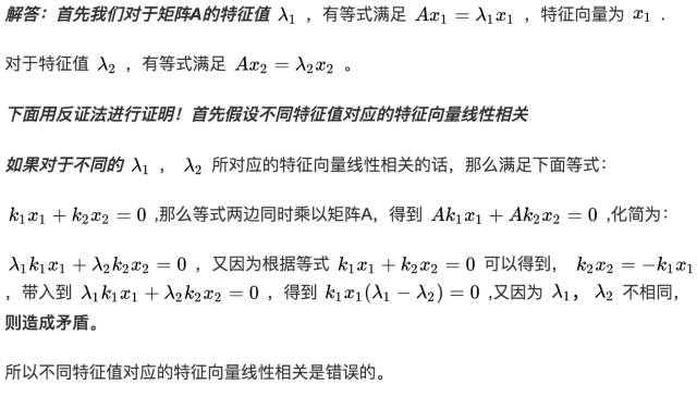 从几何的角度出发,其实对理解更加有帮助。特征向量表示的是矩阵变换中只有伸缩变换没有旋转变换的方向向量,特征值是这个方向的伸缩系数,一个方向当然只有一个伸缩系数。