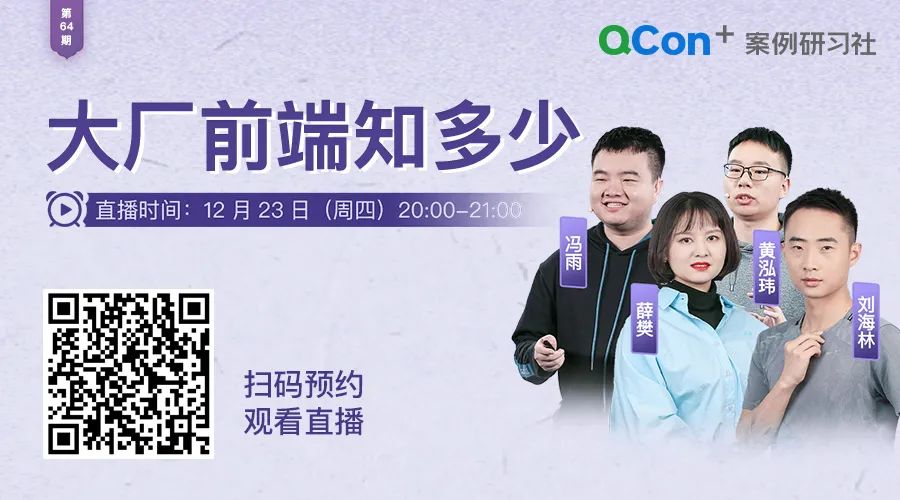 今晚 8 点,几位来自大厂的前端工程师冯雨、黄泓玮、刘海林、薛樊将直播分享「大厂前端知多少」,聊一聊他们的职场生活和职业规划。