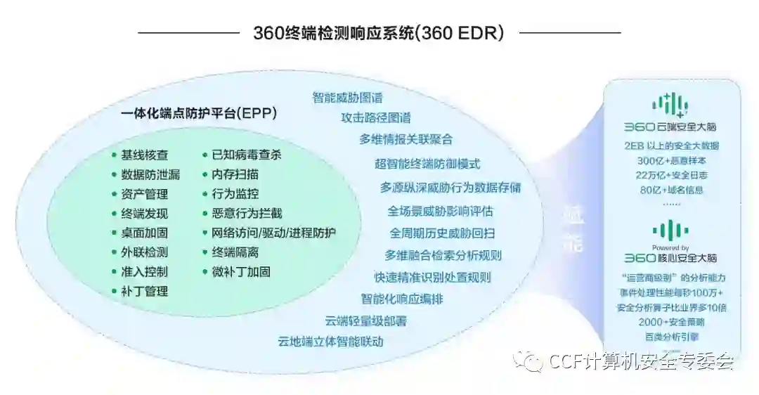 基于多年实战经验积累,360政企安全集团以体系化作战/对抗/攻防思维的新战法为指导,打造了一套以云端安全大脑为核心的数字安全能力框架。在此框架下,构建了面向未来的EDR方案——360终端检测响应系统(简称“360EDR”)。360EDR依靠云端安全大脑在数据、情报、专家等方面的赋能,以及核心安全大脑“运营商”级的分析算力支撑,构建了“云地一体化”架构,以低成本、高效率、易部署的优势满足互联网和隔离网场景下的安全防护需求。