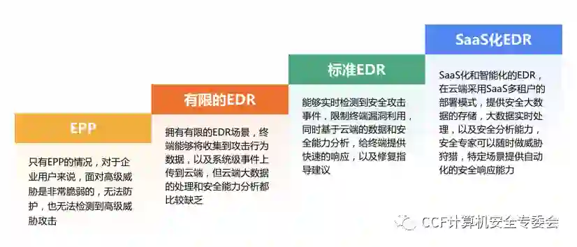 特级:SaaS化和智能化的EDR,在云端采用SaaS部署模式,提供安全大数据的存储、数据实时处理、关联分析、并行查询以及秒级响应能力,支撑安全专家随时进行主动的威胁狩猎。同时基于查杀引擎、知识图谱和AI技术实现技术提升,使得EDR越来越智能化,包括对海量安全事件的自动分类、自动分优先级和对攻击行为采取自动响应等,极大地体现了下一代EDR的智能化特点。