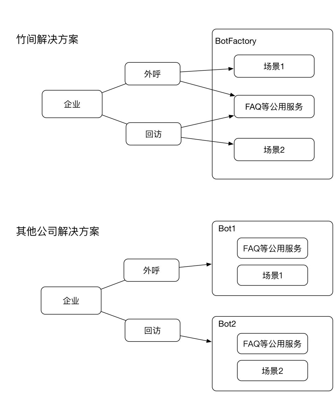 其他公司方案:每个机器人对应一套话术,一些通用性内容如产品及服务介绍,需要在两套话术中预先放置。
