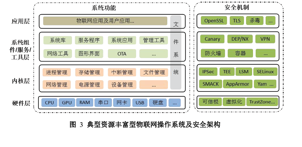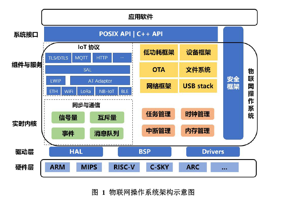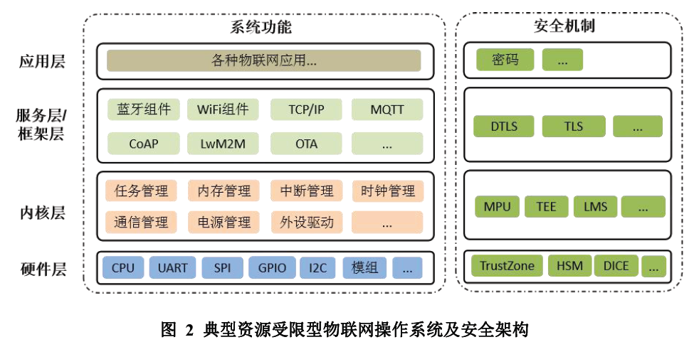 物联网操作系统是支持物联网技术大规模发展的核心基础软件,包括操作 系统内核、外围组件和服务、物联网安全框架等,以支持构成具有低功耗、安全 通信属性的物联网软件平台。物联网操作系统的内核通常具备任务管理、中断管 理、异常处理、时钟管理、存储管理、同步与通信等功能。物联网操作系统向下 协调和控制各种软件硬件资源,向上提供统一的应用编程接口,降低物联网应用 开发的复杂度、成本和时间。物联网操作系统的架构如图1 所示。由于物联网操作系统具有不同的架构和安全机制,因此在安全性、AI 支持、 实时性、资源要求等方面具有较大的差异。如工业控制的物联网操作系统必须满 足强实时性要求,而用于智能家居终端设备的物联网操作系统的实时性要求则不 高。
