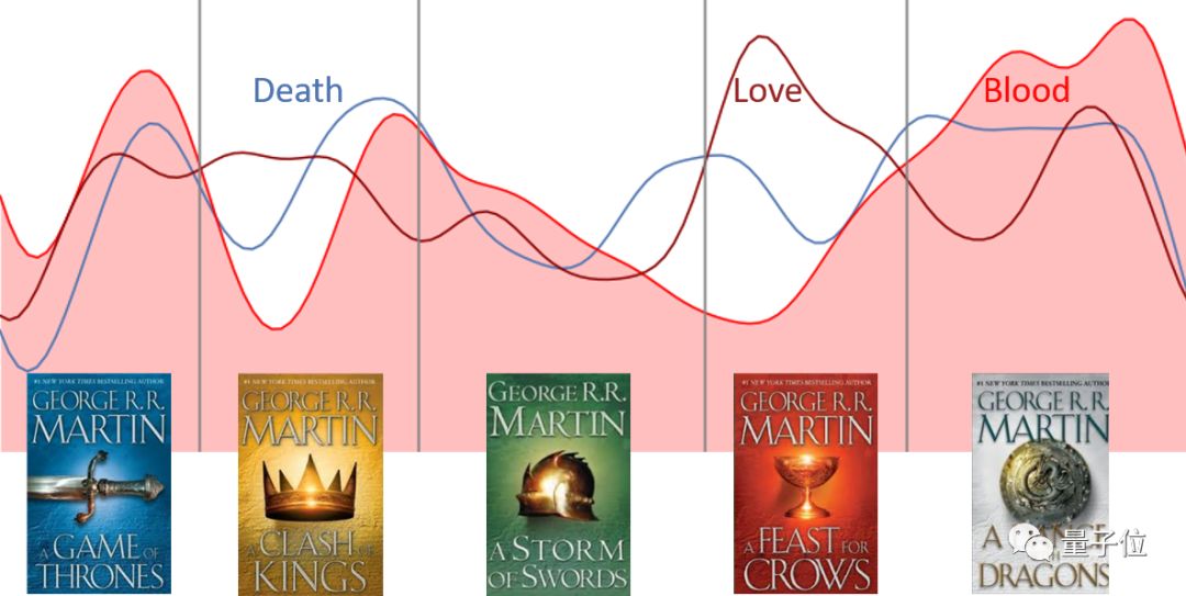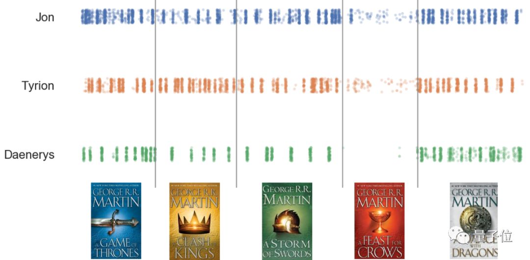 有个名叫 Peter Vesterberg 的小哥哥用机器学习的方法对《冰与火之歌》系列小说进行了文本分析。可以看到,龙妈的戏份到了第五部《魔龙的狂舞》才有了显著提升。而在第四部《群鸦的盛宴》当中,虽然三人都没有POV章节,但囧雪和小恶魔在别人的视角里戏份还挺多。