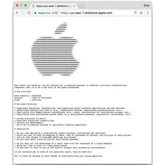 苹果网站利用一个隐藏的页面招募一名从事“关键基础设施组件”的工程师。该页面的网址是 us-east-1.blobstore.apple.com,目前已经失效。之前的内容显示,这个组件涉及 EB 级的数据、数以万计的服务器和数百万磁盘。他们希望应聘者能够设计和部署可扩展的应用和网络服务,还要熟悉 Java 8、现代服务器和分布式系统。