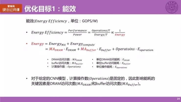 而另外我们注意到的一点是,对于神经网络固定的一个算法来说,它的总操作数也是一个固定的值,所以我们首先得到一个结论:能效值与能耗值是成反比的。那么如果要优化能效,其实我们只需要优化能耗就好了。我们的能耗越低,那能效也会越高。因此,我们把问题转化成了能耗问题。