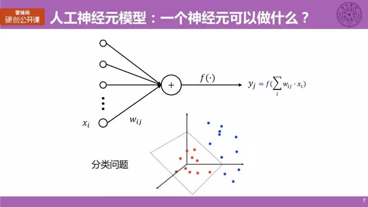 举个简单的例子。在空间中有红色和蓝色两类点。用简单的神经元,我们可以在空间中做一套曲面,将这两类点分开。这就是一个非常简单的分类问题。神经网络/神经元非常擅长用于做分类问题。