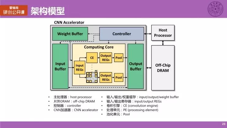 在架构里面有一个核心控制器 controller,然后片上通常会有三块 buffer,即 Input Buffer、Output Buffer 及 Weight Buffer,分别存储神经网络的输入数据、输出数据和权重。而中间的黄色部分为 Computing Core 也就是计算核心。