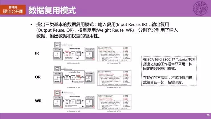 在我们的工作当中,我们提出了三类基本的数据的复用模式,分别是:输入复用(Input Reuse,IR)、输出复用(Output Reuse,OR)、权重复用(Weight Reuse,WR),他们分别充分地利用了输入数据、输出数据及权重的复用性,我们给出了三种基本复用模式的示意图以及对应的伪代码,这里就不做特别细致地展开了。